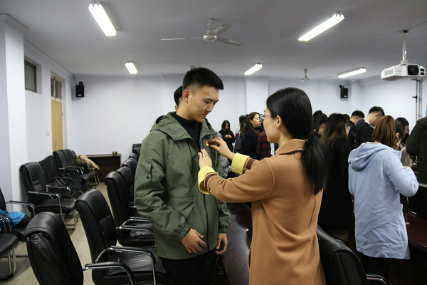 鲜红的党旗,简而有力地为现场渲染出庄重的气氛,在《国际歌》奏响后,宣誓仪式正式开始。仪式首先宣布了本次新发展的预备党员名单,接着由辅导员徐颖领誓,现场响起了阵阵激昂的宣誓声,每个同学都用发自内心的声音抒发对党忠诚的决心。徐颖老师为同学们佩戴党徽,学生第二党支部书记赵建斌老师代表学院党总支向全体新发展预备党员提出了期望和要求,他希望同学们能够发扬党的优良传统,牢记全心全意为人民服务的宗旨,积极发挥党员的先锋模范作用,无愧于"共产党员"的光荣称号。