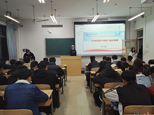 竞赛以“回顾历史,弘扬精神”为主题,我院学生积极报名参与本次答题活动。试题库涵盖了抗美援朝期间的英雄人物、重要战役、历史意义、相关报道等多个方面。70年前,为了保卫和平、反抗侵略,党和国家毅然作出抗美援朝、保家卫国的历史性决策,英雄的中国人民志愿军高举正义旗帜,同朝鲜人民和军队一道,舍生忘死、浴血奋战,赢得了抗美援朝战争伟大胜利,为世界和平和人类进步事业作出巨大贡献。如今,为了缅怀先烈功绩,本院举行了本次竞赛,同学们认真答题,通过竞赛的情况看,同学们对抗美援朝了解的非常清楚。竞赛结束后,由学院老师、大众评委等组成的评委团队从专业与公平的角度进行了甄选,最终评出了优胜选手,并给予优胜同学相应的奖励。