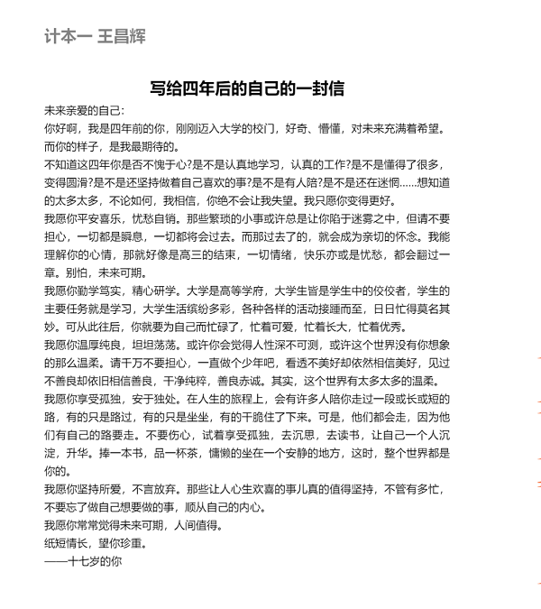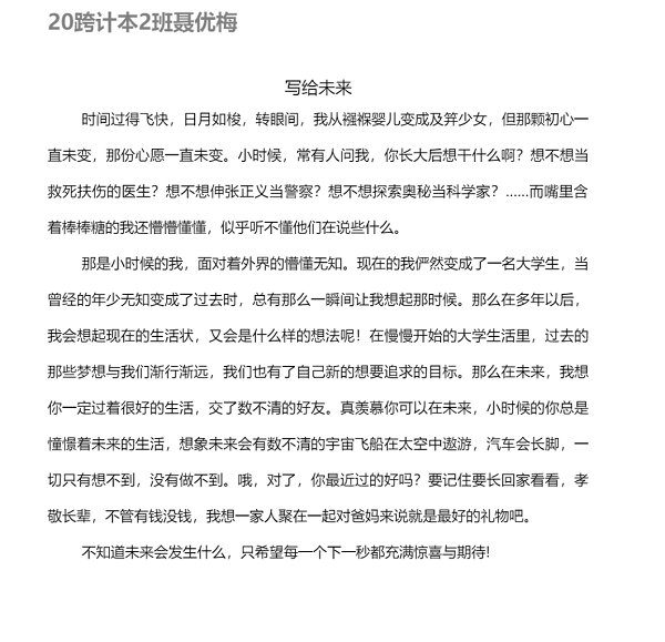 本次书信活动是以“写给未来的一封信”为主题,以目前的大学生活为基础,要求同学们给未来的自己写一封信。书信内容可以总结现在,展望未来;也可以从思想、学业、生活、师生关系、同学关系等方面进行规划描述;还可以朋友的口吻,以说话谈天的形式,与未来的自己说话谈天。活动通知发出后,受到了同学们的积极响应。活动期间,同学们认真撰写书信,思考自己未来的成长目标、设想一年后年后心与心的对话。书信写好后以电子版的形式上交,经过评委的反复斟酌,评出了优秀作品,并给予优胜同学相应的奖励。
