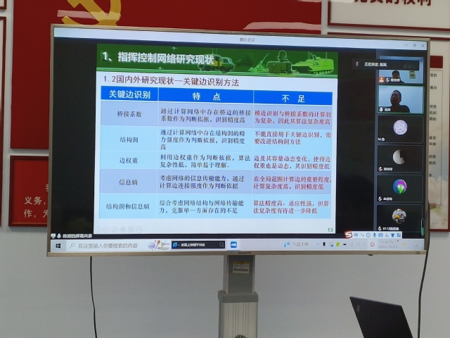 报告主要从指挥控制网络研究现状、指挥控制网络建模方法、关键节点识别方法、关键边识别方法、失效控制等五方面展开,详细讲授了指挥控制网络抗毁策略研究中的一系列关键问题。陈教授报告内容深刻,逻辑性强,讲解清晰,深受老师和学生们欢迎。报告结束后,陈教授和聆听报告的师生就指挥控制网络抗毁策略研究的热点问题深入探讨,并对教师提出的问题解答,现场氛围活跃。