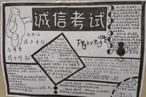 诚实守信自古以来就是中华民族的优良传统,期末考试临近,英国上市公司365学生会学习部特此宣传诚信理念,鼓励同学们积极创作诚信考试手抄报。活动前期工作由学生部发布活动通告,然后同学们结合自己的创意与实际情况制作手抄报,然后按照发布的通告在规定时间内将作品发送到指定邮箱,同学们创作的作品统一体现了诚信考试这一主题,同时反映了同学们积极备考的乐观心态。活动的最后将由学习部统一评选,评选过程服从公平、公正、公开的原则。