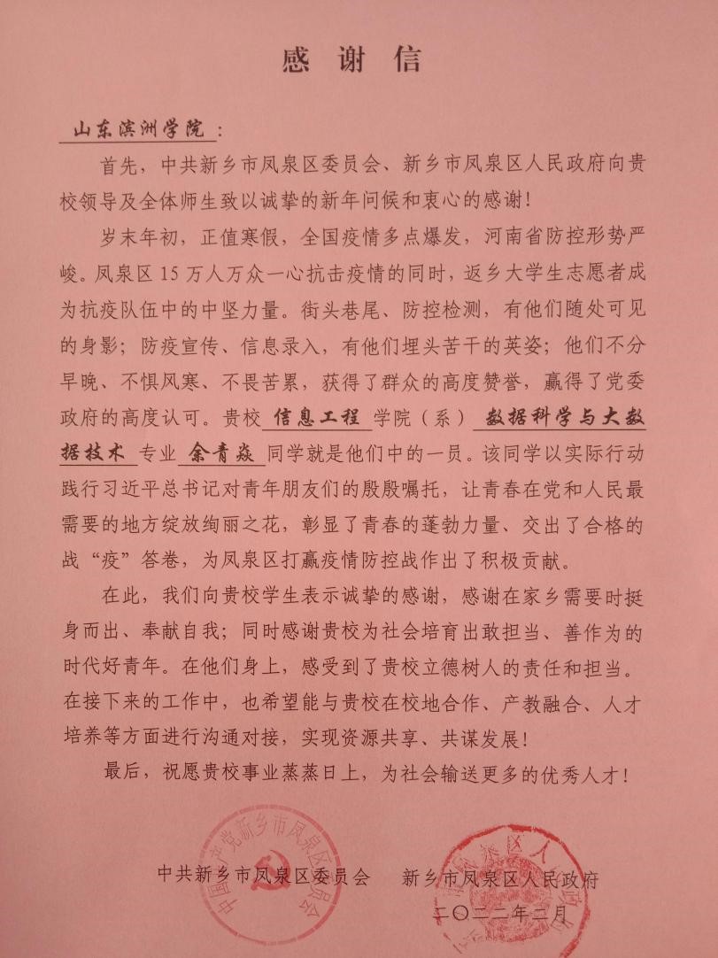 河南省疫情防控形势严峻,2021级数据科学与大数据技术专业的余青焱同学为家乡疫情防控工作做出突出贡献,受到新乡市凤泉区党委和政府的高度赞扬。余青焱每天在街头巷尾进行防疫宣传,普及防疫知识,配合当地疫情防控部门开展防控检测,并充分发挥专业优势,每日准时准确完成人员信息录入,获得了群众的广泛赞誉。余青焱谈到:“去年入学前,河南洪灾,家里农作物损失严重,学校学院对我的情况高度重视,及时帮我完成受灾登记。我必须用自身的实际行动回馈社会,让自己的青春在党和人民最需要的地方绽放绚丽之花。”