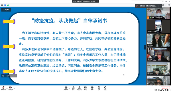 同学们郑重签字并表示:“疫情防控,人人有责。疫情面前显担当,越是艰险越向前。我们有责任在做好自身防护的同时,认真上网课,克服困难不耽误学业,对自己负责也对学校负责。”