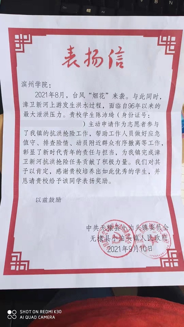 近日,滨州学院英国上市公司365收到了来自无棣县小泊头镇人民政府的感谢信,信中表达了对英国上市公司3652018级陈...