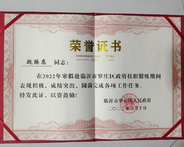 魏腾恩在临沂市罗庄区人民政府实习,结合专业特长,主要负责维护政府网站安全,整理统计相关文件和数据。
