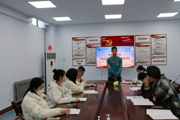 会议伊始,学生会主席陈宇对学生会上半学年各项工作进行总结,并表达了对上半年工作的肯定,同时,也指出工作中存在的一些问题和不足。各部门学生会干事依次进行发言,对自己的工作业绩、工作计划、学习成绩、值班情况等进行了详细说明。各负责人根据干事们的发言,结合平时的工作表现对其进行一些问题询问与考察,综合以上情况进行评价与评分。