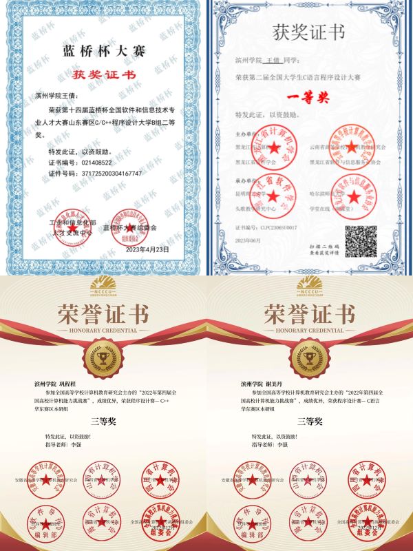 在比赛中表现出色。班级同学曾多次在校级及以上的各种活动中获得奖项,比如获得全国大学生C 语言程序设计大赛一等奖,蓝桥杯三等奖等多种奖项。学生们自我管理,在学校举办的各项大型活动时,活动的前期准备工作学生自发组织,同学们积极参与。