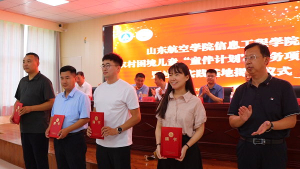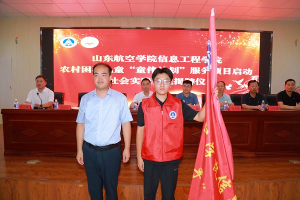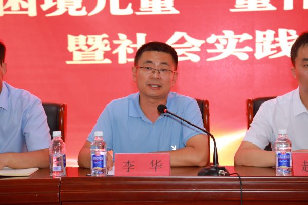 李华对沾化区委区政府对项目的支持表示了衷心的感谢,并全面介绍了学校70年办学历史及发展特色。李华寄语广大志愿者要勤于学习,扎根基层,奉献基层;要增强纪律观念,树牢安全意识,快乐充实的完成暑期社会实践任务;要勇于展示自我,发挥专业特色,助力乡村科技振兴。王文涛为全体指导教师颁发聘书,袁利华为志愿队伍授旗。