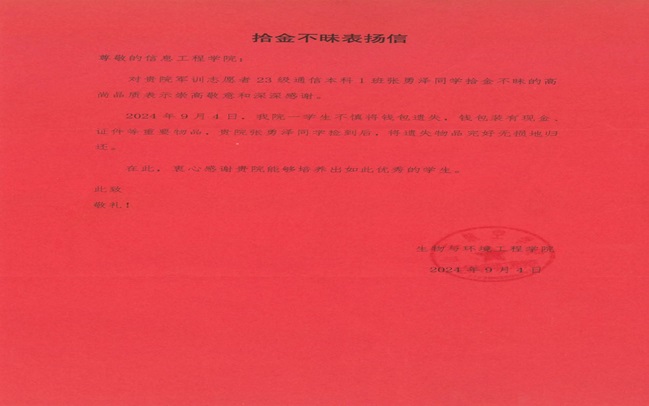金秋九月,一场别开生面的军训正在如火如荼地进行。在严肃而有序的训练场上,除了汗水与坚毅,更有一股暖流在悄然流淌。这股暖流源于一封拾金不昧表扬信。一位来自信息工程学院的张勇泽学生,用他的实际行动,展现了高尚的品德,诠释了新时代青年应有的责任与担当。