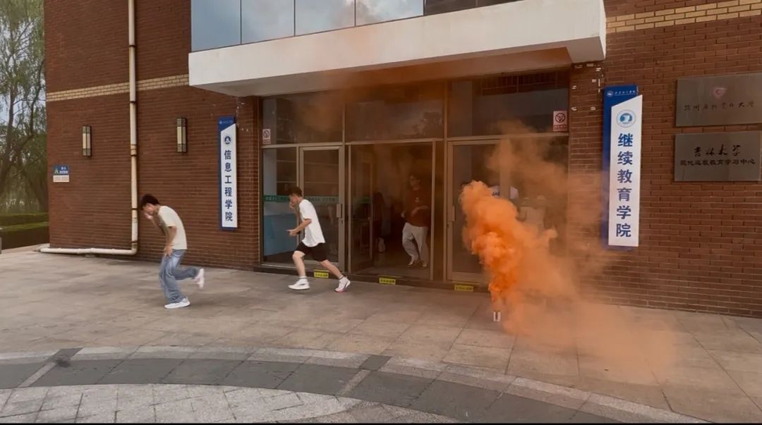 演练开始前,保卫处老师结合近几年高校火灾真实案例,讲解学校火灾预防、扑救相关知识,并详细介绍了紧急情况下逃生方法和注意事项,强化师生消防安全意识与应急能力。在模拟火灾疏散演练环节,警报响起后,各小组迅速组织学生用湿毛巾掩住口鼻,沿预定路线,弯腰低姿,有序撤离至安全空旷区域。