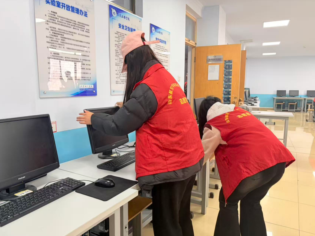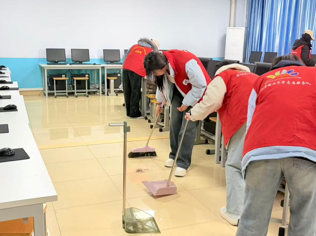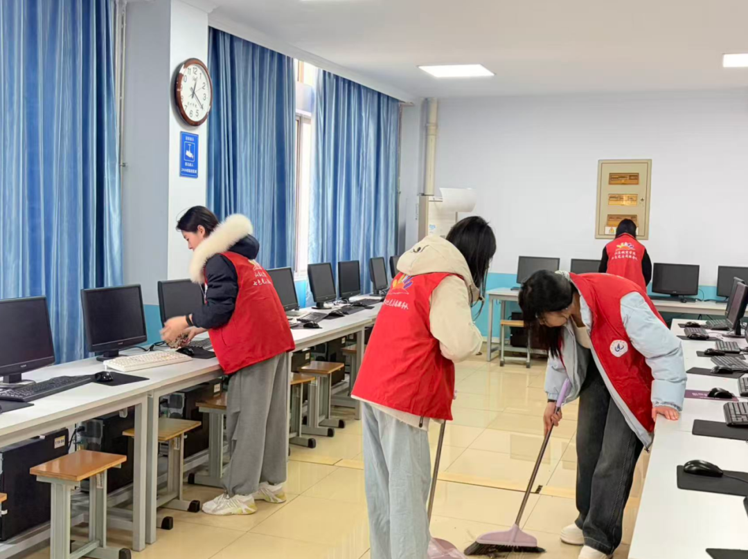 活动伊始,志愿者们有序分工,明确了清扫区域与职责。大家手持清洁工具,对微机房内的电脑主机、显示器、键盘、鼠标等设备进行细致擦拭,清理了桌面杂物、地面灰尘及边角积尘,同时对线路整理、设备归位等细节问题逐一完善。过程中,同学们相互协作、干劲十足,不放过任何一处卫生死角,用实际行动践行着“奉献、友爱、互助、进步”的志愿精神,使微机房整体环境焕然一新,更加整洁规范、秩序井然。