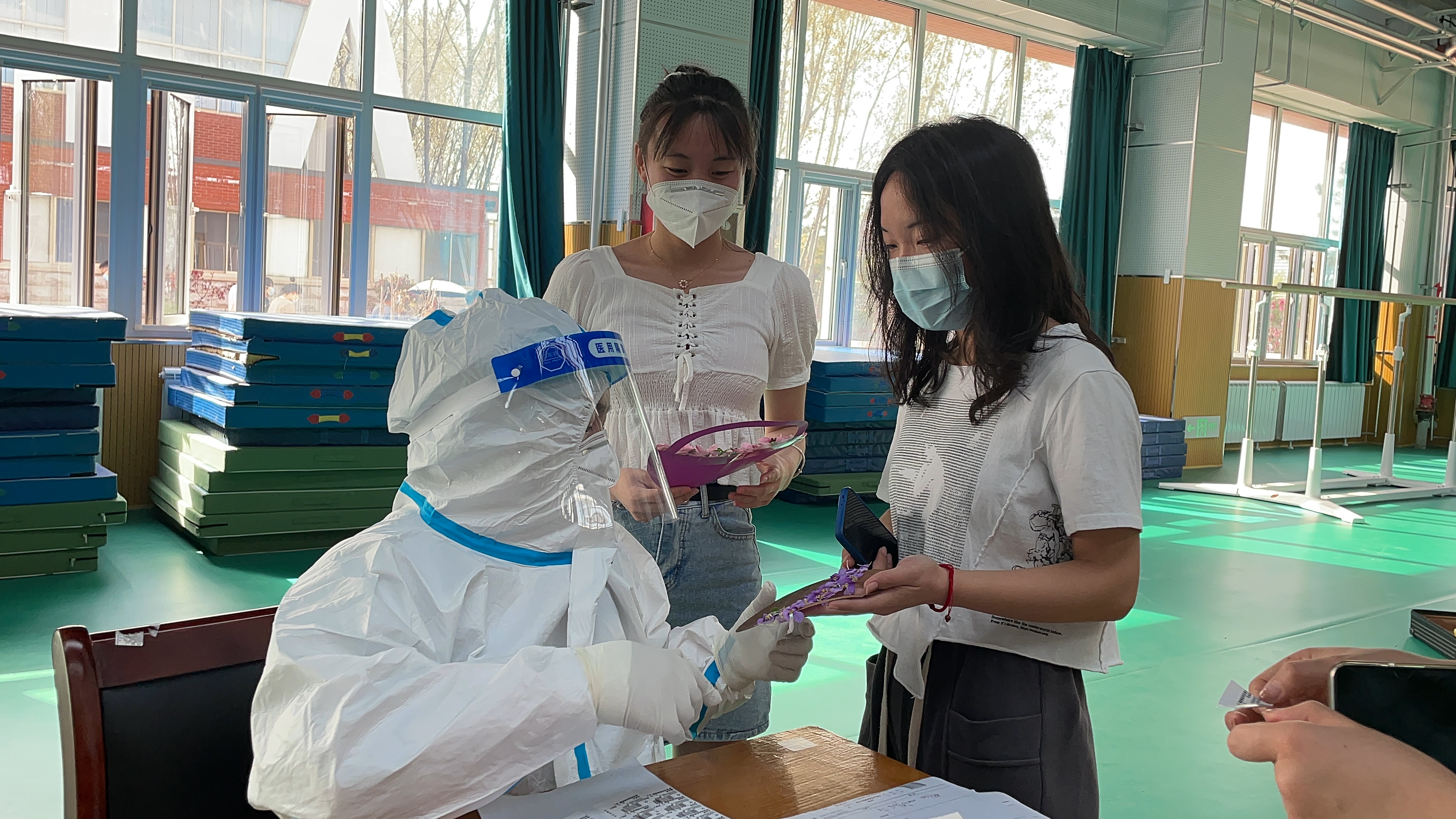 滨州疫情形势严峻以来,身穿防护服的医护人员坚守岗位,为学生、老师和学校工作人员进行核酸检测,以确保学...
